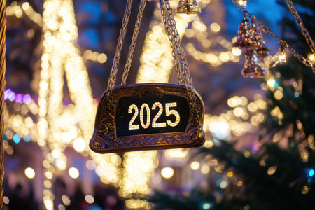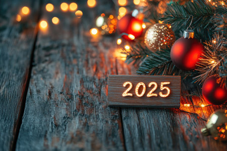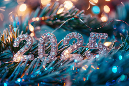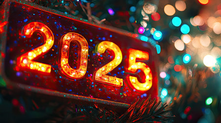 Colorful ornaments and sparkling lights create a joyful atmosphere as the year 2025 is celebrated with festive decorations.