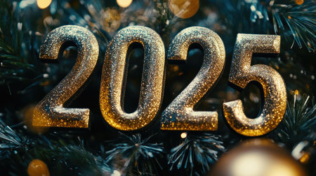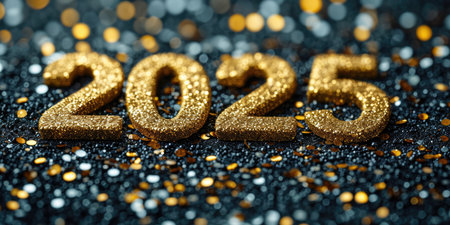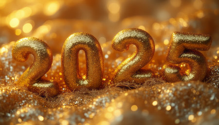 Golden glitter numbers 2025 surrounded by sparkling decorations, creating a festive and celebratory atmosphere.