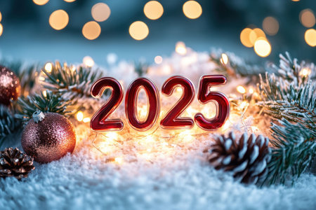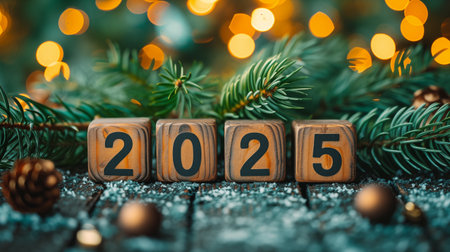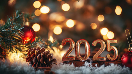 The festive setting features the year 2025 surrounded by cozy lights pine cones and Christmas tree branches evoking holiday warmth.