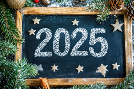 New Year chalkboard with festive decorations, pine branches, stars, and ornaments Seasonal concept for celebration and holiday spirit