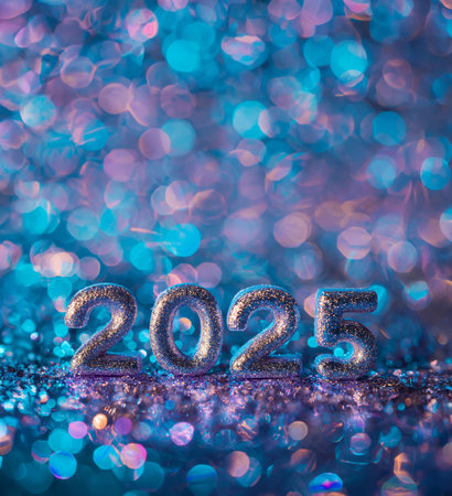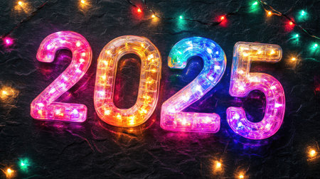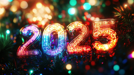 A vibrant and colorful decoration featuring the year 2025, capturing the festive spirit of New Year's celebrations with bright lights and cheerful ambiance.
