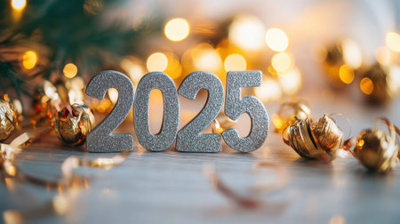 The sparkling numbers 2025 sit among festive decorations creating a celebratory atmosphere for the upcoming New Years festivities.