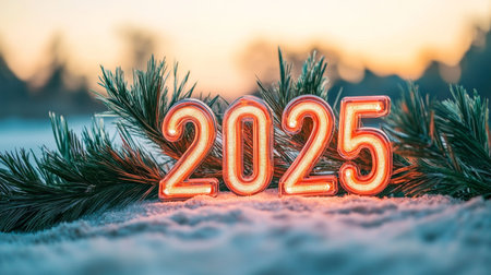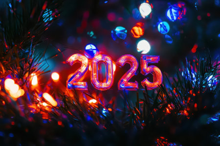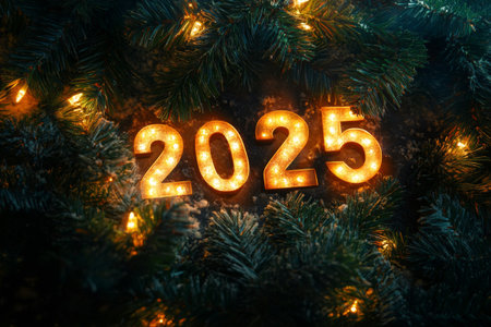 Bright holiday lights illuminate the numbers 2025 among green pine branches creating a festive atmosphere for New Year celebrations.