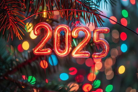 Brightly colored lights signify the arrival of 2025 creating a joyful holiday atmosphere among evergreen branches.