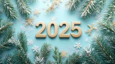 Golden volumetric numbers 2025 in the center on a pale green background with spruce branches