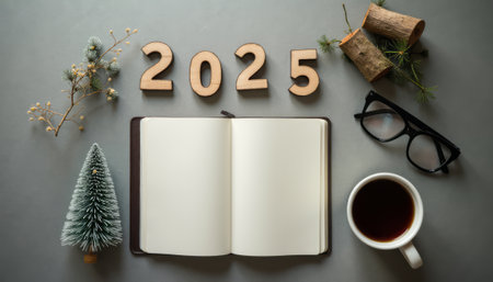An open notebook lies on a gray surface, flanked by wooden numbers spelling 2025, a small evergreen tree, and a steaming cup of coffee. This cozy scene captures the essence of New Year planning, inviting reflection and fresh beginnings amidst natural elements.