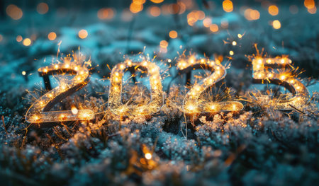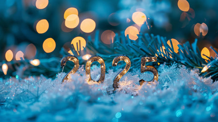 Close-up of the numbers 2025 created with string lights, placed on a snowy surface, sparkling brightly against a blurry background of blue and gold lights.