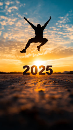 A dynamic silhouette of a man leaping into the year 2025 against a vivid sunset backdrop, embodying aspirations and new beginnings.