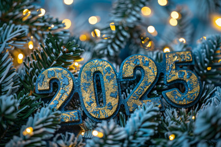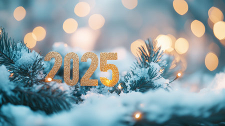Golden 2025 ornament nestled in frosted evergreen branches with festive lights, creating a warm and joyous New Year celebration scene.