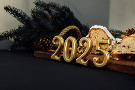 Numbers 2025. Christmas stollen on a wooden board with green branches of a Christmas tree. Christmas background, Christmas desserts