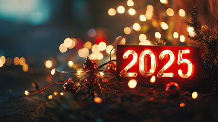 Christmas decorations with glowing 2025 sign among pine branches and twinkling lights. New Year greeting card