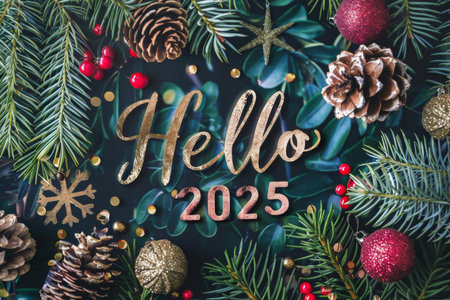 Golden text Hello 2025 amidst Christmas decorations with pine branches, AI Generated