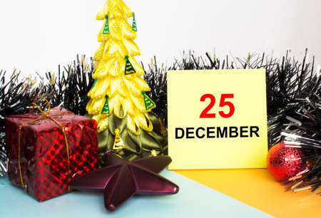 Christmas concept. Festive table with Christmas decorations and calendar dated December 25