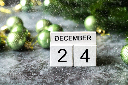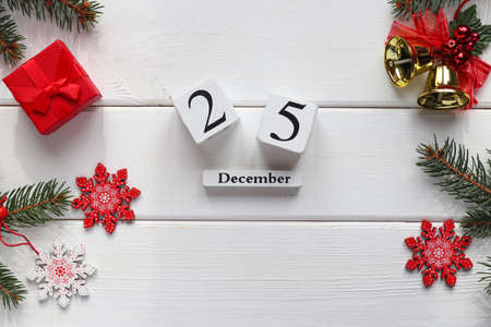 Christmas composition from wooden calendar cubes and Christmas tree decorations. December 25 - Christmas.