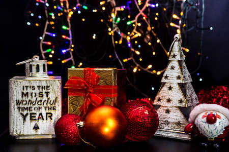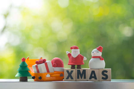 Wooden blocks against a rustic wood background with Christmas tree, Santa Claus and lights. Background with christmas decor. Christmas background. Winter months.