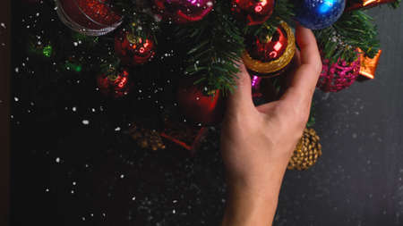 Greeting Season concept.hand setting of ornaments on a Christmas tree with decorative light