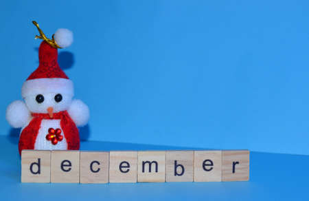 December month written in wooden letters on a blue background. The calendar. Winter. Snowman on the background.