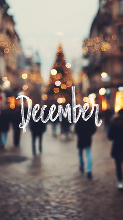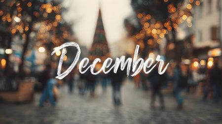 December is written on a blurred background with bokeh Christmas tree lights and people at Christmas market