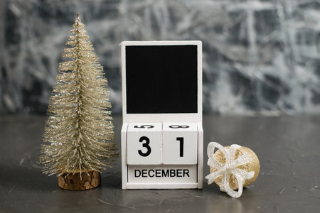 Wooden calendar with December 31 date and beautiful Christmas decoration on dark textured background with copy space.