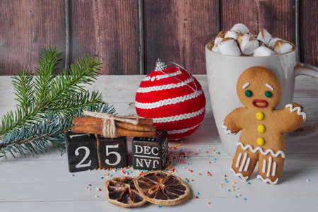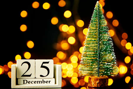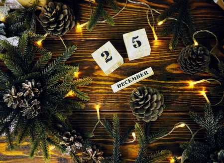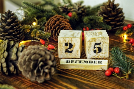 Wooden calendar December 25. Winter and Christmas holidays concept. Cozy scene. Background with christmas decor. Christmas background.
