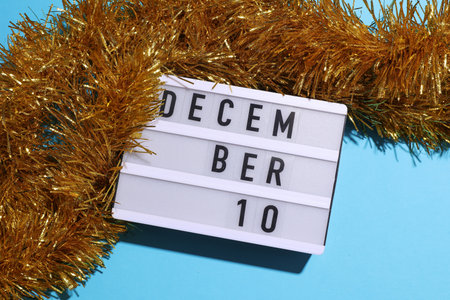 Lightbox calendar with text December 10 with Christmas, New Year winter decor on blue background
