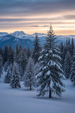 A serene winter landscape featuring snow-laden pine trees on a misty mountain slope bathed in the soft pastel hues of sunrise.