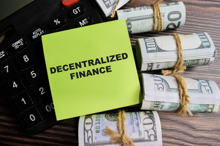 Concept of Decentralized finance write on sticky notes isolated on Wooden Table.