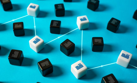 A close-up view of interconnected wooden cubes, signifying the concept of networks, connections, and collaboration on a smooth blue surface. The simple design emphasizes the importance of interconnected systems in today's globalized world.