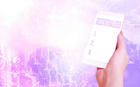 Conceptual hand writing showing Decentralized. Concept meaning move departments away from a single administrative center Modern gadgets white screen under colorful bokeh background