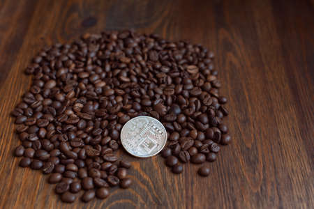 Coin cryptocurrency qtum on table and digital currency money concept