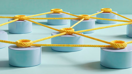 This image showcases a network of blue cylindrical forms connected by yellow rope, forming a complex web. The composition features a clean, minimalistic aesthetic with a pastel background. This conceptual representation can be used for diverse purposes in technology and data visualization.