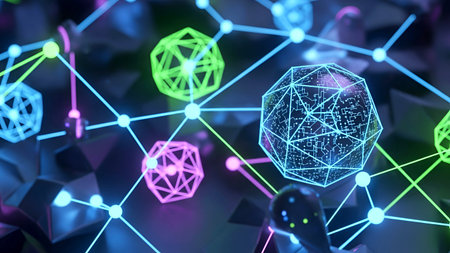 This image features a complex network of interconnected geometric shapes, including spheres, cubes, and polyhedrons. The shapes are rendered in vibrant colors such as green, blue, and pink, and are connected by thin lines forming a web-like structure. The background is dark, which accentuates the luminosity and intricate details of the shapes and their connections. The overall composition suggests themes of technology, data networks, or abstract art.