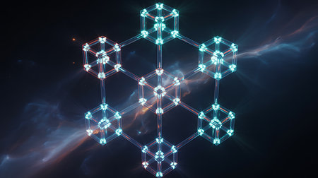 3D rendering of abstract hexagonal structure with glowing particles on dark background