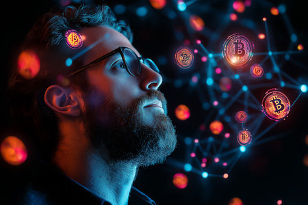 A man with glasses looks up thoughtfully as cryptocurrency icons hover in a digital web around him.