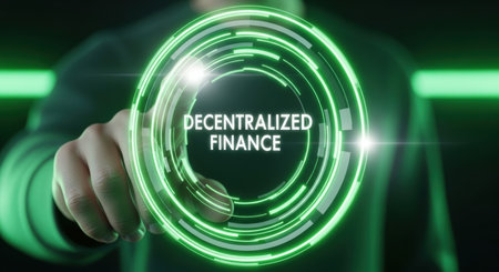 A human hand points at a glowing green digital interface displaying decentralized finance, symbolizing modern financial technology and blockchain innovation.