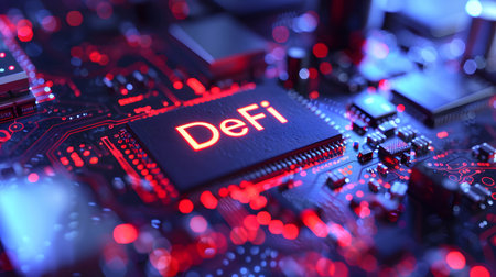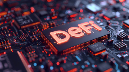 Word “DeFi†on microchip board, decentralized finance, financial services without the involvement of intermediaries, financial centers or banks