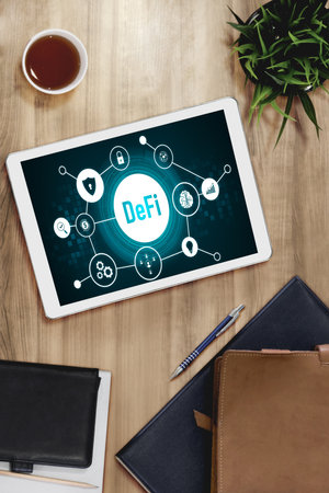 Decentralized finance or DeFi concept on modish computer screen . The defi system give new choice of investment and money saving .