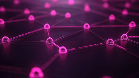 This stunning abstract image features a futuristic digital network with glowing pink nodes, illuminating connections across a dark surface, symbolizing technology and communication.
