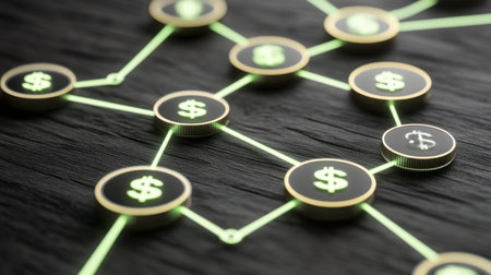 A visually striking illustration of a digital financial network, featuring interconnected dollar symbols on a wooden background, representing technological advancements in modern economics.