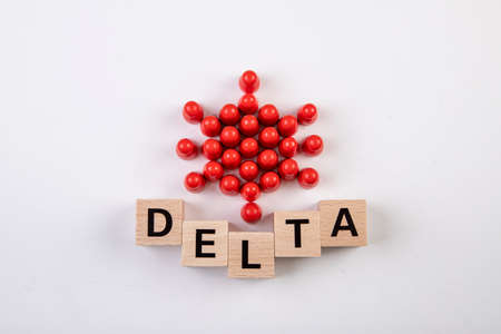 wooden blocks with the word delta and red figurines building a symbol vor the virus