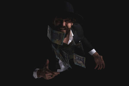 young businessman throwing money in the air and being arrogant on black studio background