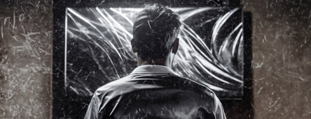 Man in front of the cracked glass, a reflection of shattered thoughts and time. Silhouette against the backdrop of fragmented reality offers depth. Panorama with copy space..
