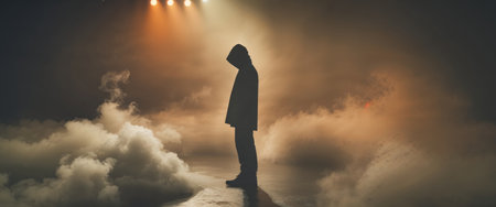AI Generated. Silhouette Person Stands in Smoky Stage Lighting