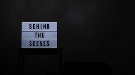 Behind the scenes letterboard text on Lightbox or Cinema Light box. Movie clapperboard and director chair. Background black color. camera shootin in video production studio.
