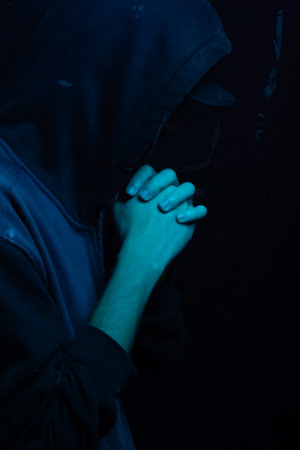 Scary woman with black nails and hood on her head in the dark
