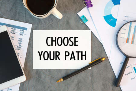 CHOOSE YOUR PATH is written in a document on the office desk with office accessories, coffee, diagram and smartfon