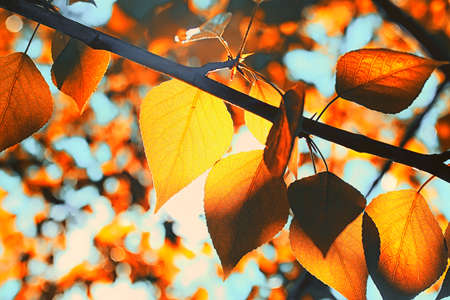 Fall, autumn, leaves background. A tree branch with autumn leaves on a blurred background. Landscape in autumn season.