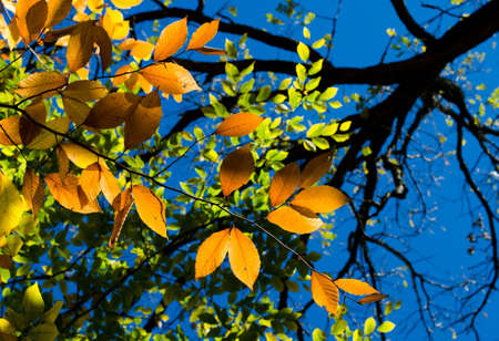 Autumn landscape, Autumn leaves with the blue sky background, Yellow, red and green bright leaves and branches, fall themes