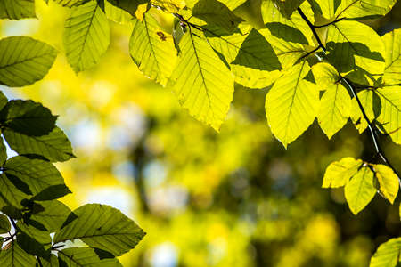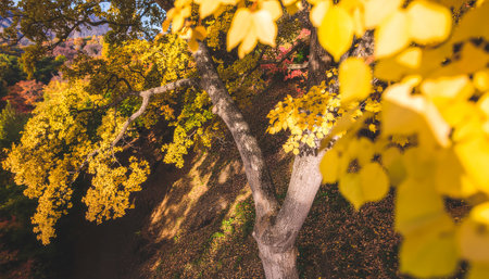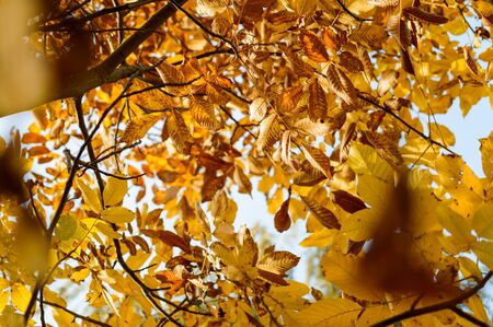 Close up of bright vibrant yellow leaves on a tree branches in autumn park. Detail of fall forest foliage.
