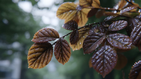 A stunning close-up image capturing the intricate details of dew-covered brown leaves against a serene green forest backdrop during a rainy day. Emphasizes nature's beauty.